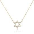 This refined Magen David necklace exemplifies timeless craftsmanship and meaningful design. Made from 14k yellow gold, it features a combination of 1mm natural diamonds in a shared  prong solitaire setting that offers a unique. The pendant measures approximately 15mm while the 16.5" chain length provides optimal positioning at the neckline. The combination of precious metal, genuine diamond, and symbolic geometry creates a piece of enduring value—equally suited for daily wear or special occasions.